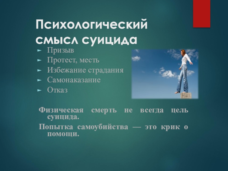 Психологический смысл суицида ПризывПротест, местьИзбежание страданияСамонаказаниеОтказФизическая смерть не всегда цель суицида.Попытка самоубийства — это крик о помощи.