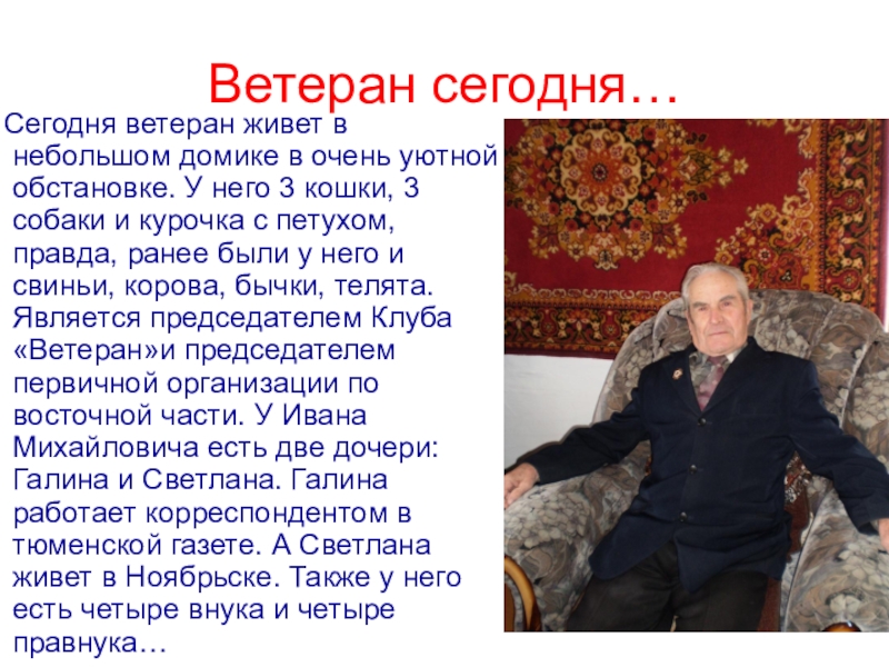 уютной обстановке. У него 3 кошки, 3 собаки и курочка с петухом, правда, ранее были у него и свиньи, корова, бычки, телята. Является председателем Клуба «Ветеран»и председателем первичной организации по восточной части. У Ивана Михайловича есть две дочери: Галина и Светлана. Галина работает корреспондентом в тюменской газете. А Светлана живет в Ноябрьске. Также у него есть четыре внука и четыре правнука…