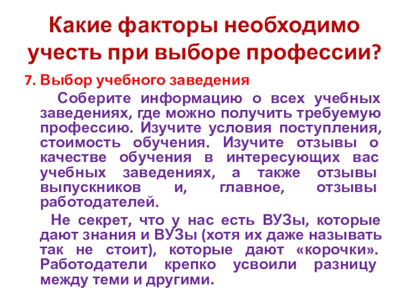 Слайд 7Какие факторы необходимо учесть при выборе профессии?