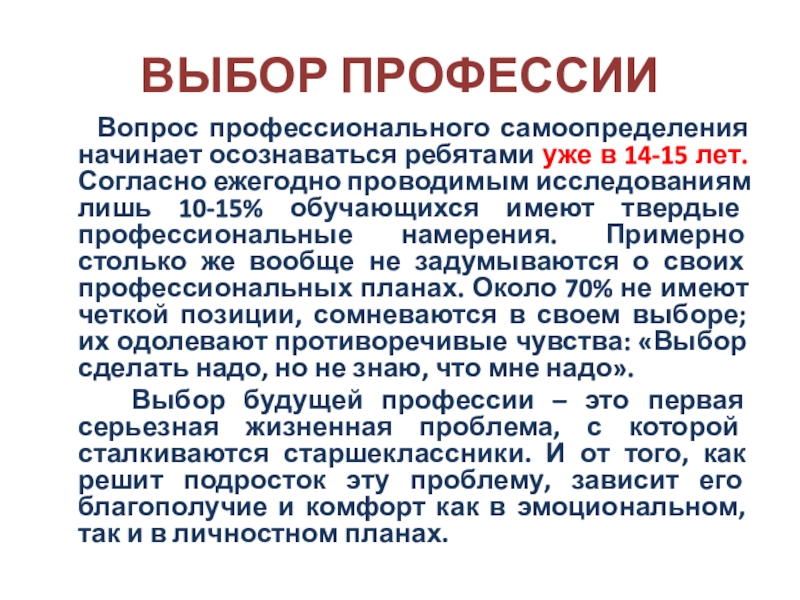 в 14-15 лет. Согласно ежегодно проводимым исследованиям лишь 10-15% обучающихся имеют твердые профессиональные намерения. Примерно столько же вообще не задумываются о своих профессиональных планах. Около 70% не имеют четкой позиции, сомневаются в своем выборе; их одолевают противоречивые чувства: «Выбор сделать надо, но не знаю, что мне надо».
