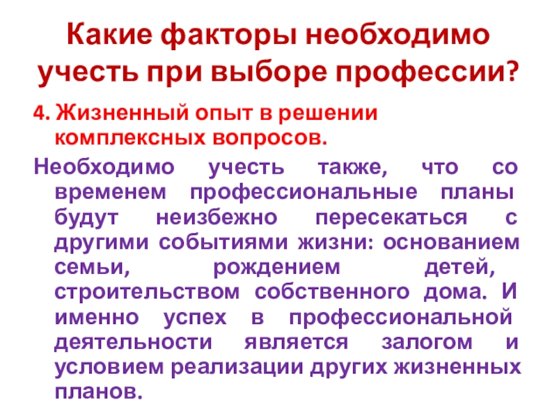 Необходимо учесть также, что со временем профессиональные планы будут неизбежно пересекаться с другими событиями жизни: основанием семьи, рождением детей, строительством собственного дома. И именно успех в профессиональной деятельности является залогом и условием реализации других жизненных планов.
