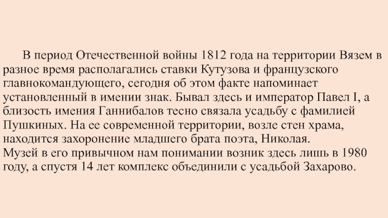 усадьбах: в сельце Захарово и в поселке Большие Вяземы. В Захарове сохранился дом бабушки поэта Марии Ганнибал, в котором открыт музей пушкинского детства, а в соседних Вяземах, старинном имении князей Голицыных, где часто бывал юный Пушкин и множество исторических лиц,