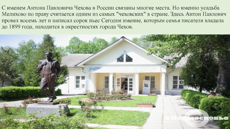 именно усадьба Мелихово по праву считается одним из самых "чеховских" в стране. Здесь Антон Павлович провел восемь лет и написал сорок пьес Сегодня имение, которым семья писателя владела до 1899 года, находится в окрестностях города Чехов.