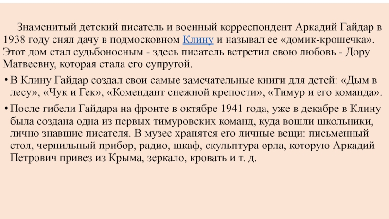 В Клину Гайдар создал свои самые замечательные книги для детей: «Дым в лесу», «Чук и Гек», «Комендант снежной крепости», «Тимур и его команда».