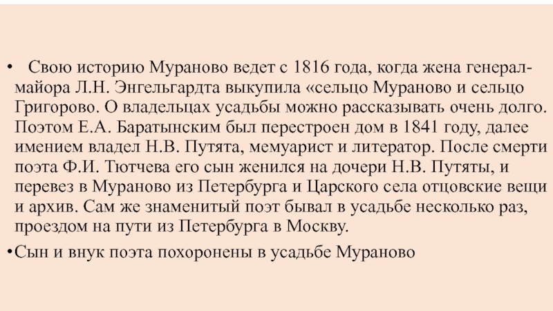 генерал-майора Л.Н. Энгельгардта выкупила «сельцо Мураново и сельцо Григорово. О владельцах усадьбы можно рассказывать очень долго. Поэтом Е.А. Баратынским был перестроен дом в 1841 году, далее имением владел Н.В. Путята, мемуарист и литератор. После смерти поэта Ф.И. Тютчева его сын женился на дочери Н.В. Путяты, и перевез в Мураново из Петербурга и Царского села отцовские вещи и архив. Сам же знаменитый поэт бывал в усадьбе несколько раз, проездом на пути из Петербурга в Москву.