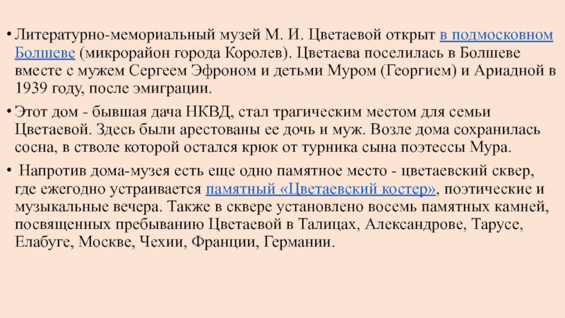 Королев). Цветаева поселилась в Болшеве вместе с мужем Сергеем Эфроном и детьми Муром (Георгием) и Ариадной в 1939 году, после эмиграции.