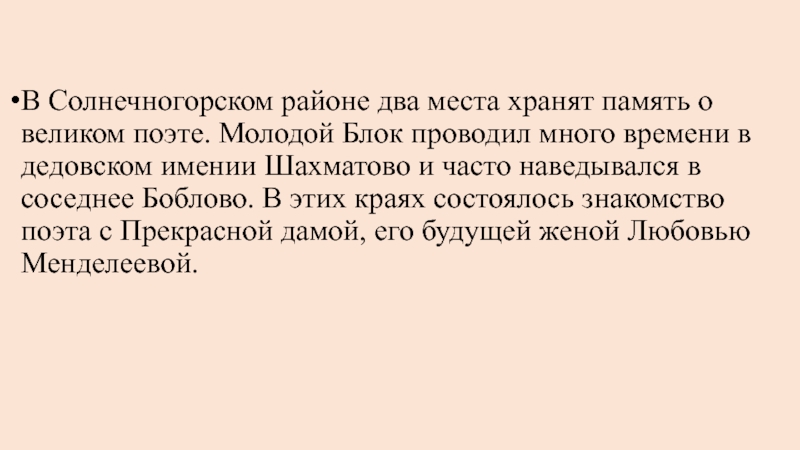 Блок проводил много времени в дедовском имении Шахматово и часто наведывался в соседнее Боблово. В этих краях состоялось знакомство поэта с Прекрасной дамой, его будущей женой Любовью Менделеевой.