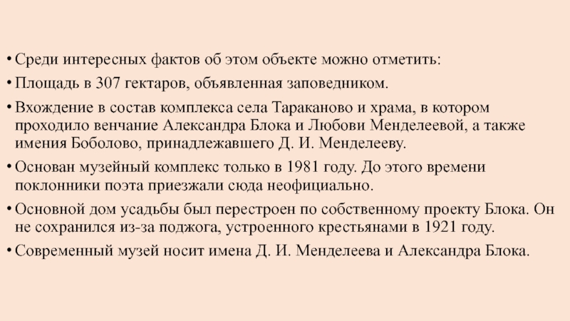 Вхождение в состав комплекса села Тараканово и храма, в котором проходило венчание Александра Блока и Любови Менделеевой, а также имения Боболово, принадлежавшего Д. И. Менделееву.