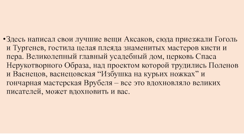 Здесь написал свои лучшие вещи Аксаков, сюда приезжали Гоголь и Тургенев,