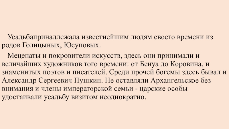 Усадьбапринадлежала известнейшим людям своего времени из родов Голицыных, Юсуповых.
