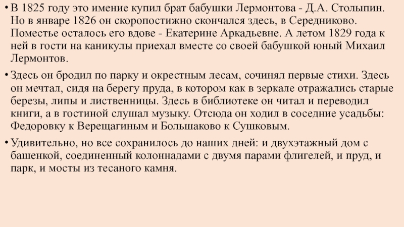 Столыпин. Но в январе 1826 он скоропостижно скончался здесь, в Середниково. Поместье осталось его вдове - Екатерине Аркадьевне. А летом 1829 года к ней в гости на каникулы приехал вместе со своей бабушкой юный Михаил Лермонтов.