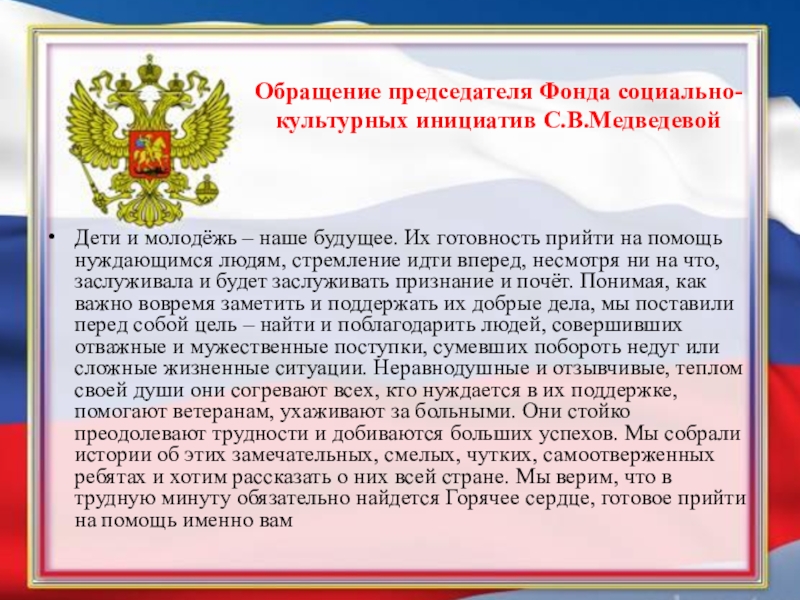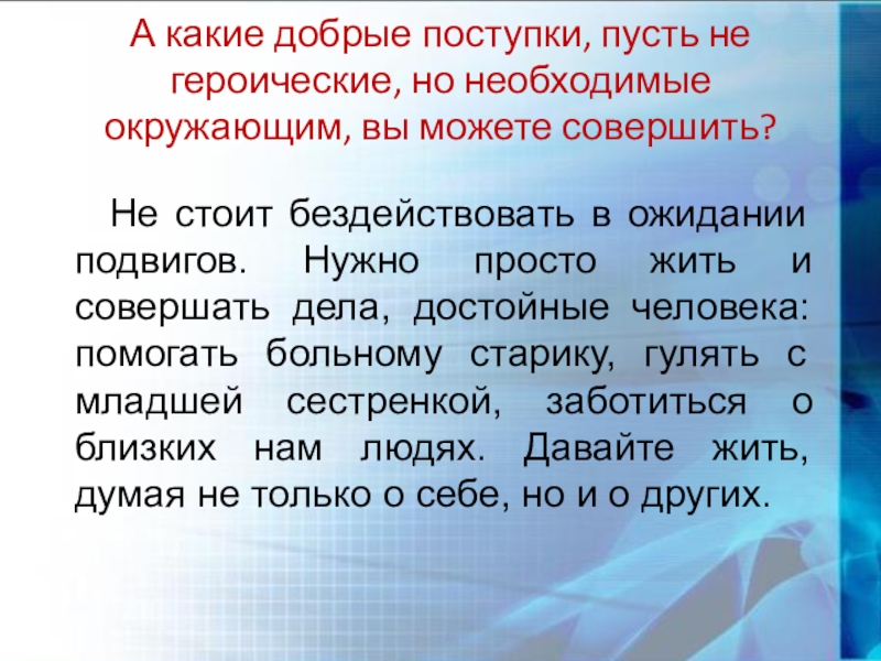 Не стоит бездействовать в ожидании подвигов. Нужно просто жить и совершать дела, достойные человека: помогать больному старику, гулять с младшей сестренкой, заботиться о близких нам людях. Давайте жить, думая не только о себе, но и о других.