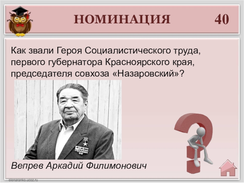 НОМИНАЦИЯ40Вепрев Аркадий ФилимоновичКак звали Героя Социалистического труда, первого губернатора Красноярского края, председателя совхоза «Назаровский»?