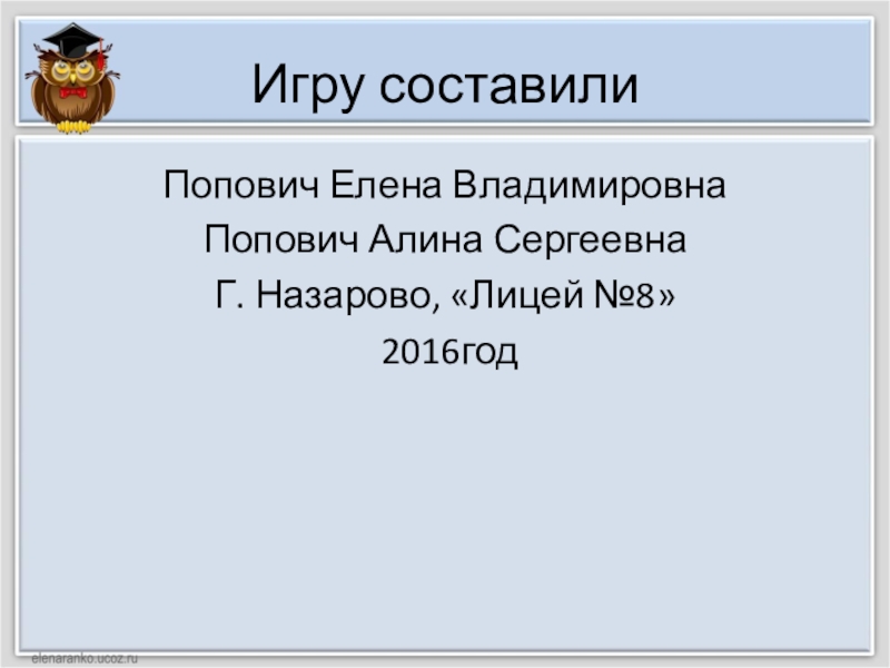 Игру составилиПопович Елена ВладимировнаПопович Алина СергеевнаГ. Назарово, «Лицей №8» 2016год