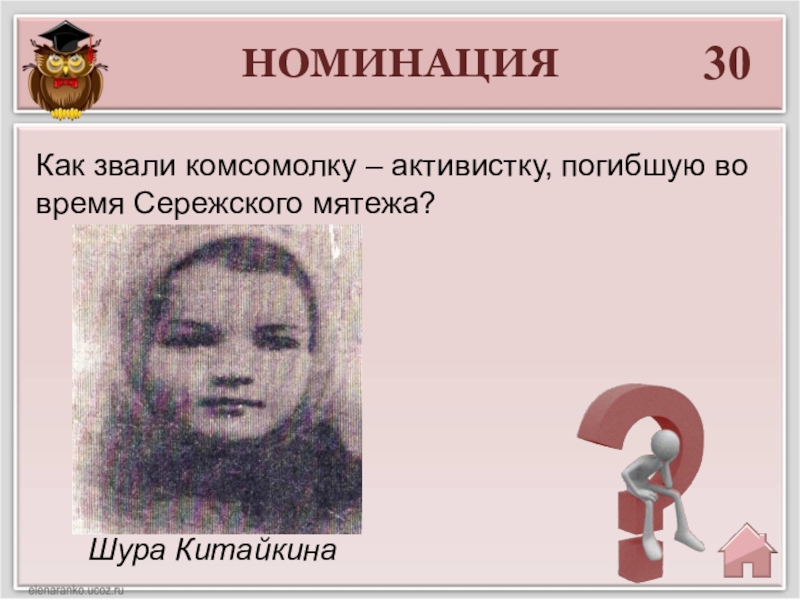 НОМИНАЦИЯ30   Шура КитайкинаКак звали комсомолку – активистку, погибшую во время Сережского мятежа?