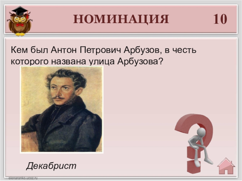 НОМИНАЦИЯ10   ДекабристКем был Антон Петрович Арбузов, в честь которого названа улица Арбузова?