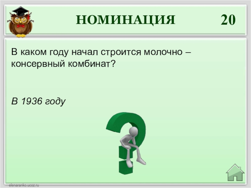 НОМИНАЦИЯ20В 1936 годуВ каком году начал строится молочно – консервный комбинат?