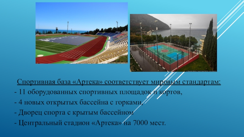 Слайд 15 Спортивная база «Артека» соответствует мировым стандартам: