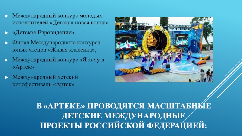 Слайд 16В «Артеке» проводятся масштабные детские международные проекты Российской Федерацией: