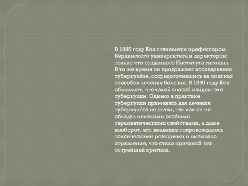 что созданного Института гигиены. В то же время он продолжает исследования туберкулёза, сосредоточившись на поисках способов лечения болезни. В 1890 году Кох объявляет, что такой способ найден- это туберкулин. Однако в практике туберкулин применять для лечения туберкулёза не стали, так как он не обладал никакими особыми терапевтическими свойствами, а даже наоборот, его введение сопровождалось токсическими реакциями и вызывало отравление, что стало причиной его острейшей критики.