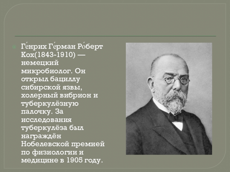 Слайд 2Ге́нрих Ге́рман Ро́берт Кох(1843-1910) — немецкий микробиолог. Он открыл бациллу сибирской