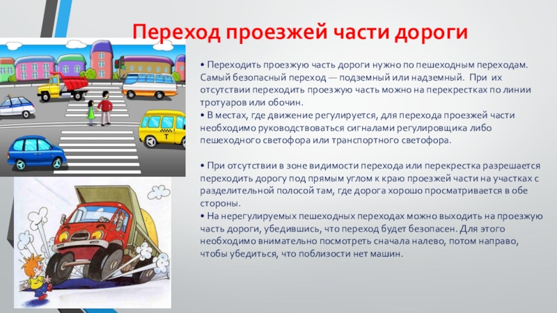 Переход проезжей части дороги• Переходить проезжую часть дороги нужно по пешеходным переходам. Самый безопасный переход — подземный