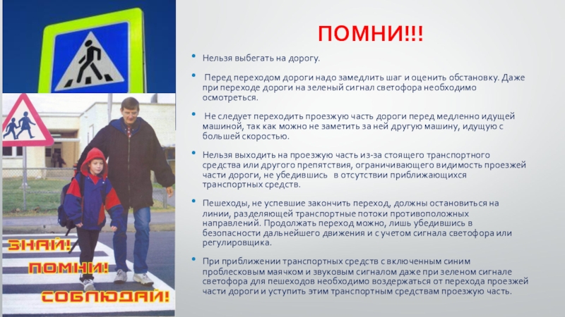 ПОМНИ!!!Нельзя выбегать на дорогу. Перед переходом дороги надо замедлить шаг и оценить обстановку. Даже при переходе дороги