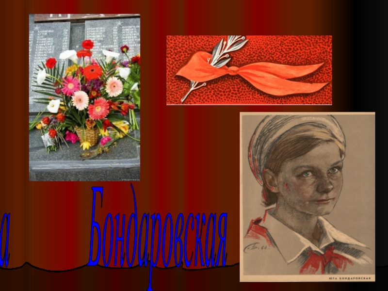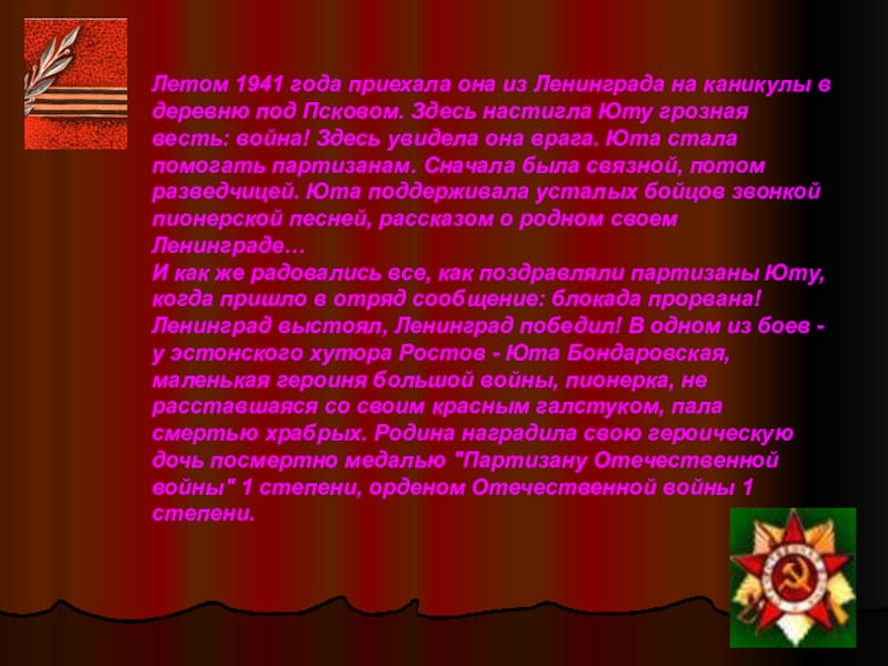И как же радовались все, как поздравляли партизаны Юту, когда пришло в отряд сообщение: блокада прорвана! Ленинград выстоял, Ленинград победил! В одном из боев - у эстонского хутора Ростов - Юта Бондаровская, маленькая героиня большой войны, пионерка, не расставшаяся со своим красным галстуком, пала смертью храбрых. Родина наградила свою героическую дочь посмертно медалью "Партизану Отечественной войны" 1 степени, орденом Отечественной войны 1 степени.