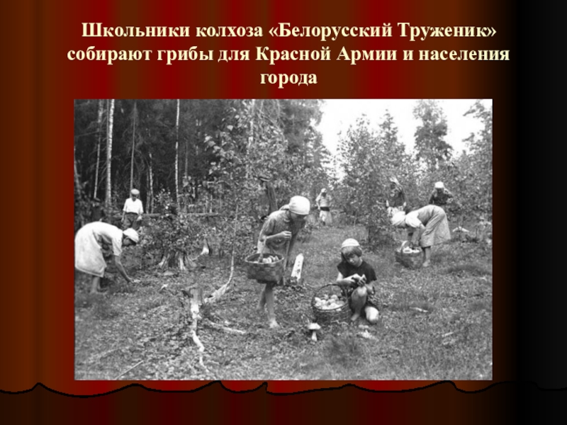 Слайд 54Школьники колхоза «Белорусский Труженик» собирают грибы для Красной Армии и населения