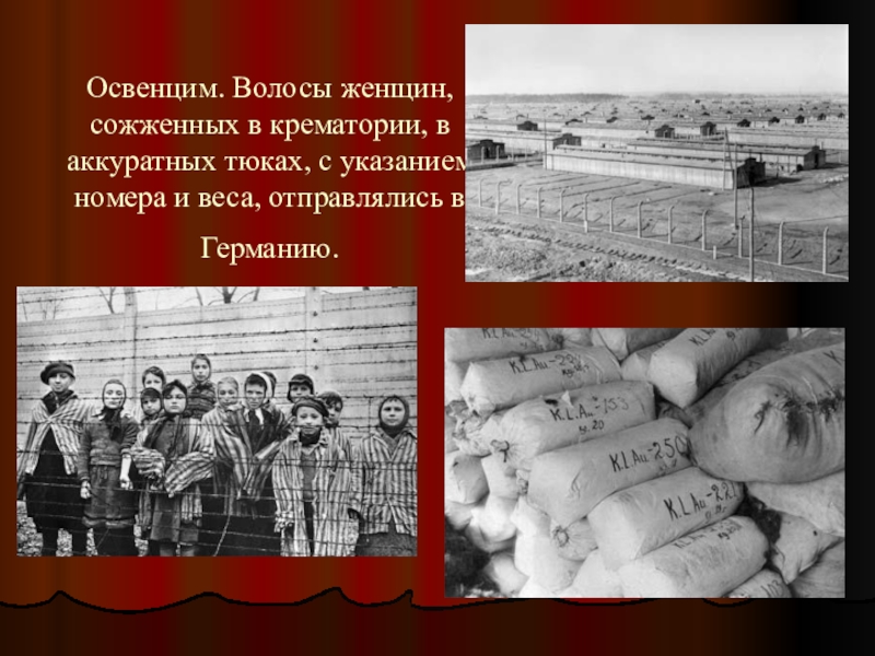 Слайд 32Освенцим. Волосы женщин, сожженных в крематории, в аккуратных тюках, с указанием