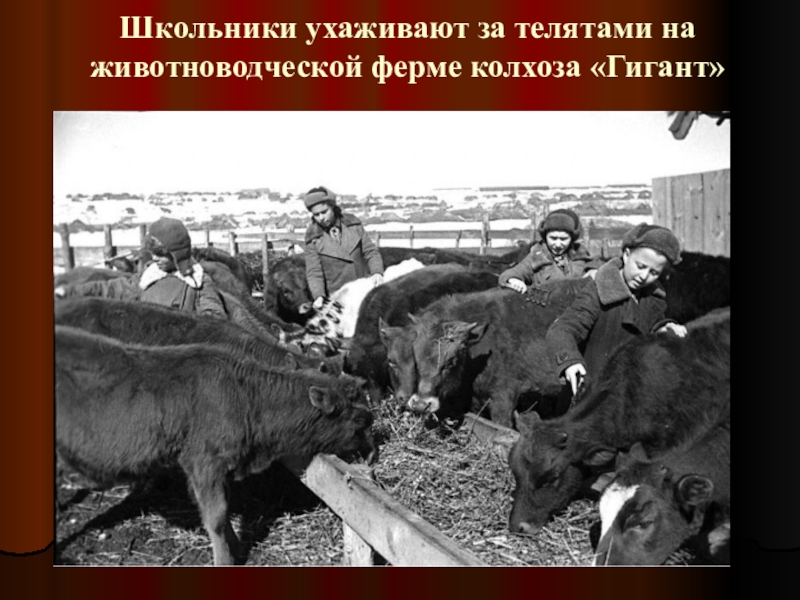 Школьники ухаживают за телятами на животноводческой ферме колхоза «Гигант»