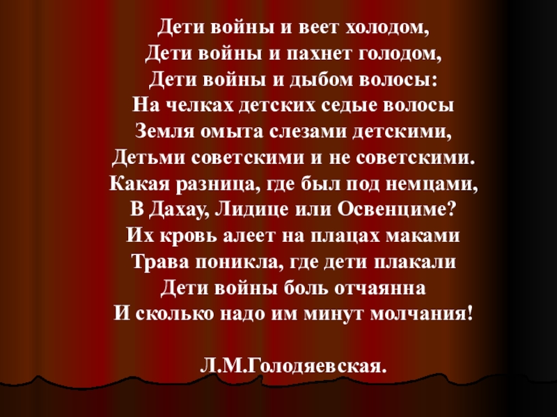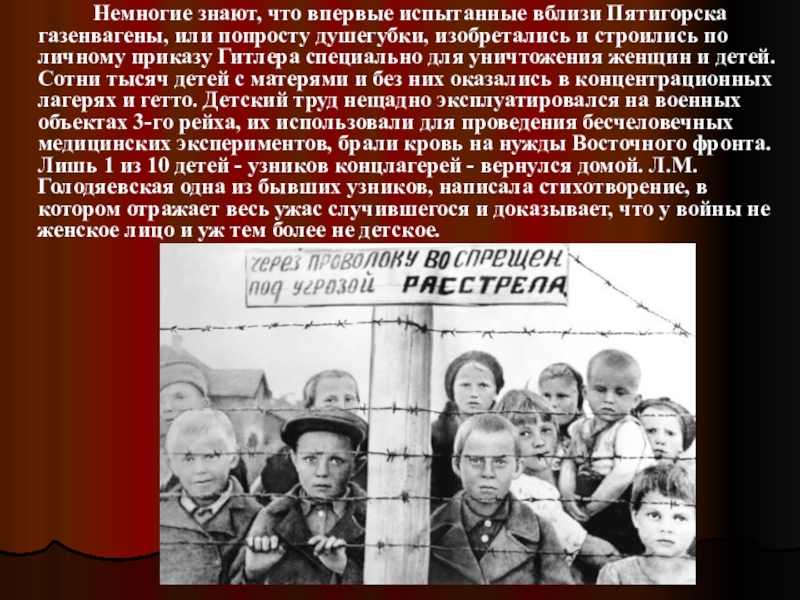 или попросту душегубки, изобретались и строились по личному приказу Гитлера специально для уничтожения женщин и детей. Сотни тысяч детей с матерями и без них оказались в концентрационных лагерях и гетто. Детский труд нещадно эксплуатировался на военных объектах 3-го рейха, их использовали для проведения бесчеловечных медицинских экспериментов, брали кровь на нужды Восточного фронта. Лишь 1 из 10 детей - узников концлагерей - вернулся домой. Л.М.Голодяевская одна из бывших узников, написала стихотворение, в котором отражает весь ужас случившегося и доказывает, что у войны не женское лицо и уж тем более не детское.