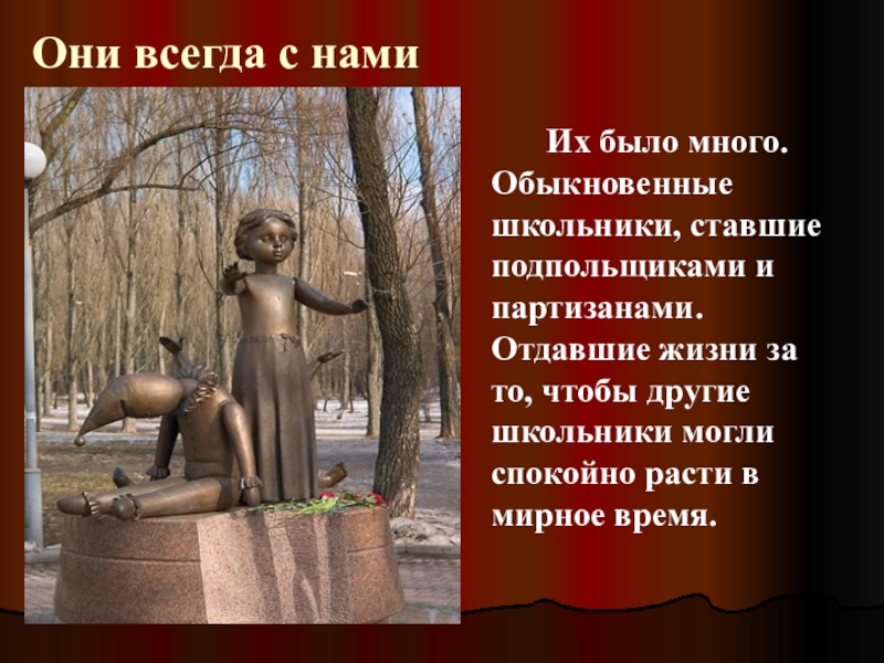 партизанами. Отдавшие жизни за то, чтобы другие школьники могли спокойно расти в мирное время.