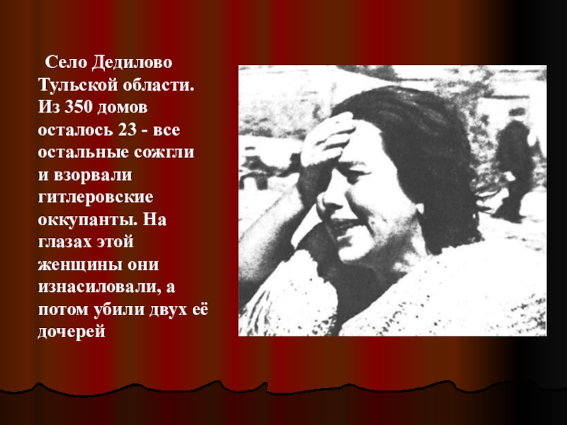 остальные сожгли и взорвали гитлеровские оккупанты. На глазах этой женщины они изнасиловали, а потом убили двух её дочерей