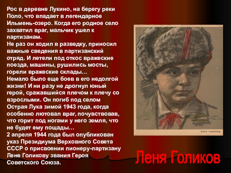 2 апреля 1944 года был опубликован указ Президиума Верховного Совета СССР о присвоении пионеру-партизану Лене Голикову звания Героя Советского Союза.