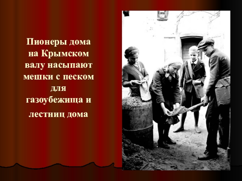 Слайд 58Пионеры дома на Крымском валу насыпают мешки с песком для газоубежища