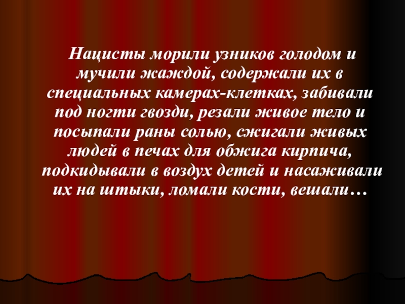 камерах-клетках, забивали под ногти гвозди, резали живое тело и посыпали раны солью, сжигали живых людей в печах для обжига кирпича, подкидывали в воздух детей и насаживали их на штыки, ломали кости, вешали…