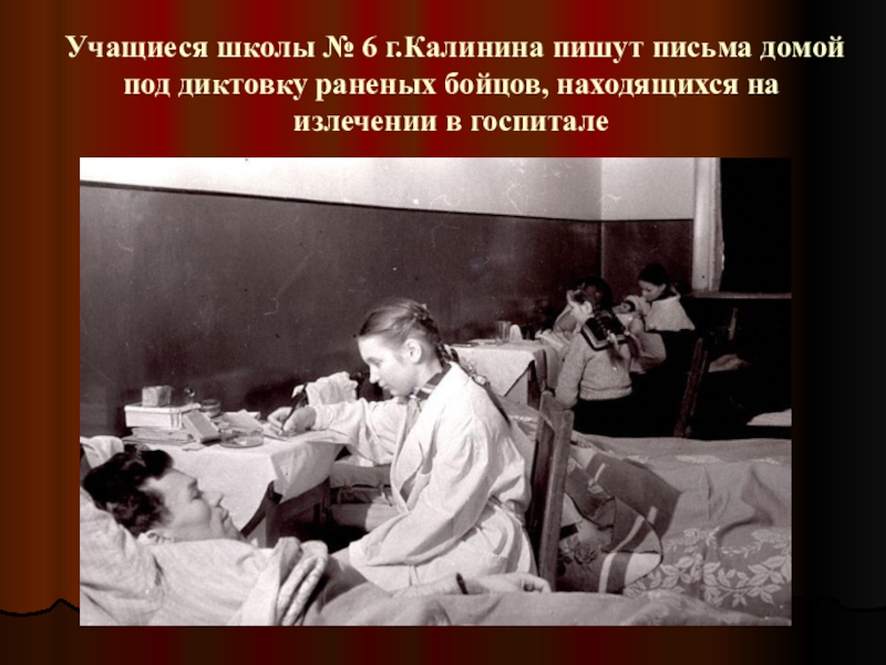 Слайд 53Учащиеся школы № 6 г.Калинина пишут письма домой под диктовку раненых