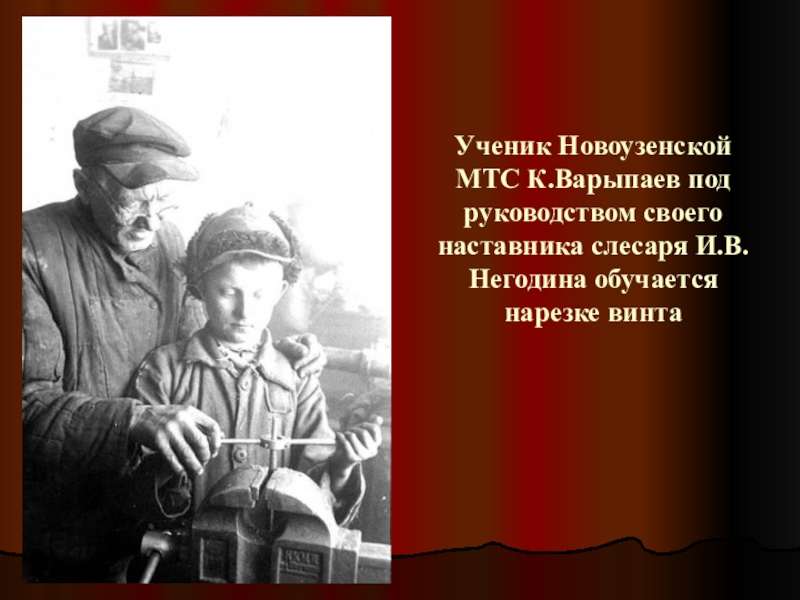 Слайд 52Ученик Новоузенской МТС К.Варыпаев под руководством своего наставника слесаря И.В.Негодина обучается