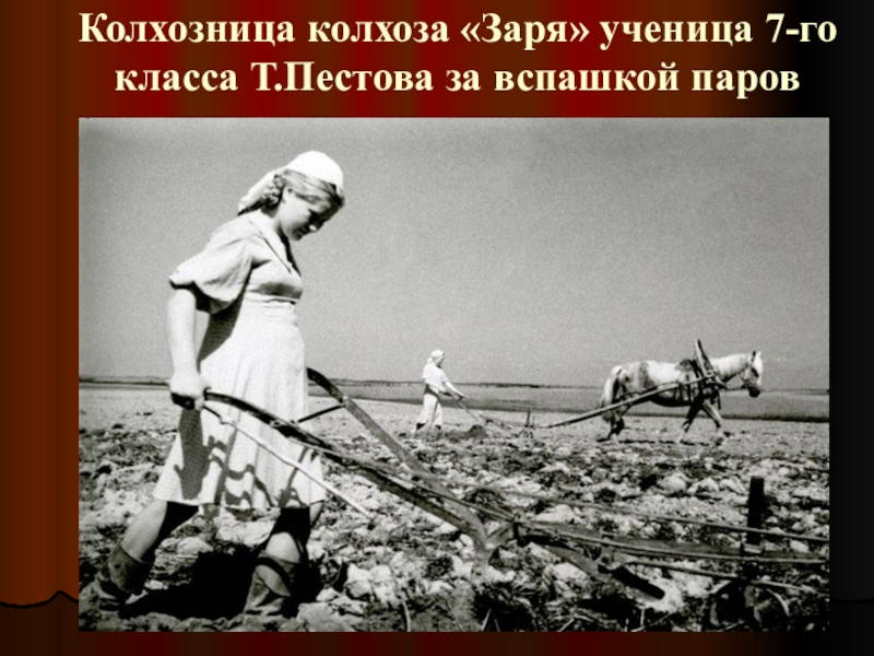 Слайд 62Колхозница колхоза «Заря» ученица 7-го класса Т.Пестова за вспашкой паров
