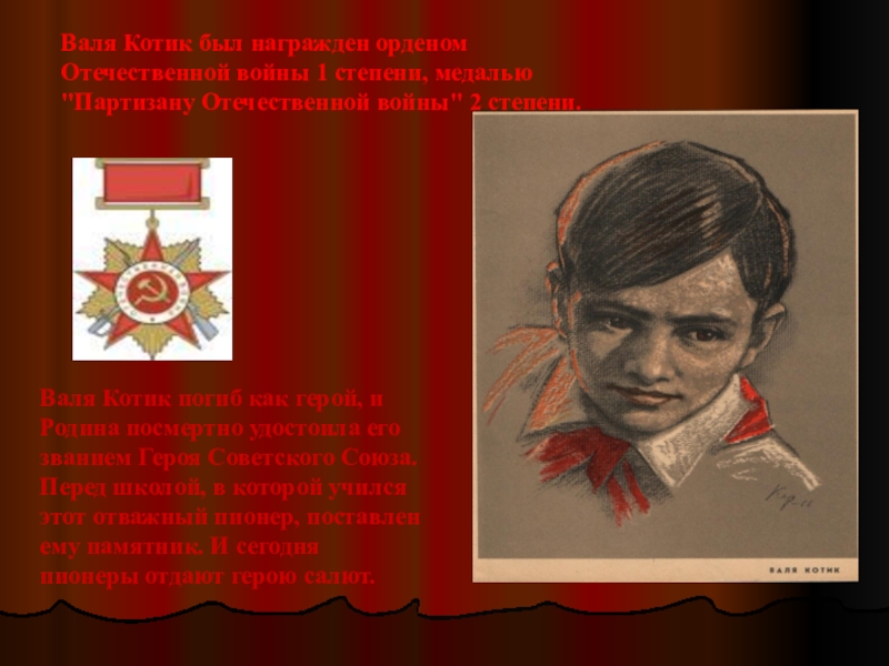 Валя Котик был награжден орденом Отечественной войны 1 степени, медалью "Партизану