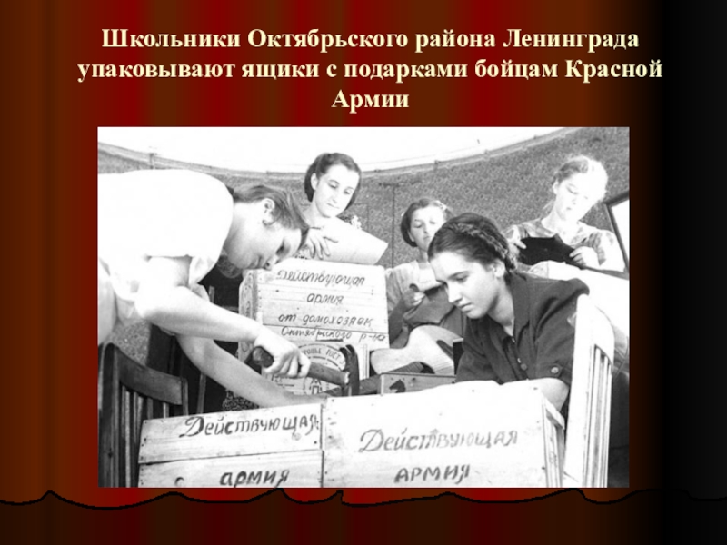 Слайд 55Школьники Октябрьского района Ленинграда упаковывают ящики с подарками бойцам Красной Армии