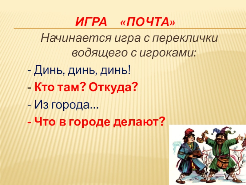 Игра   «ПОЧТА»Начинается игра с переклички водящего с игроками:	- Динь, динь, динь!	- Кто там? Откуда?	- Из
