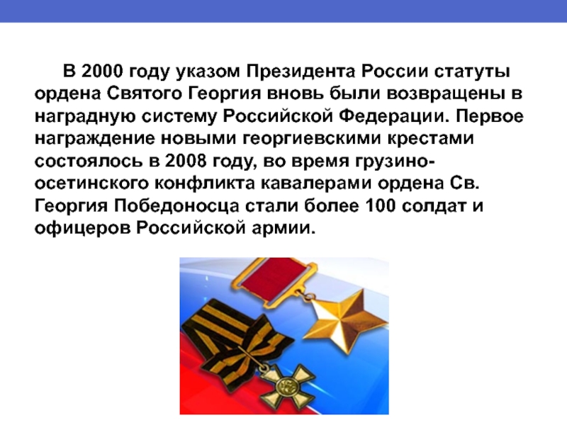 Слайд 9 В 2000 году указом Президента России статуты ордена Святого Георгия вновь