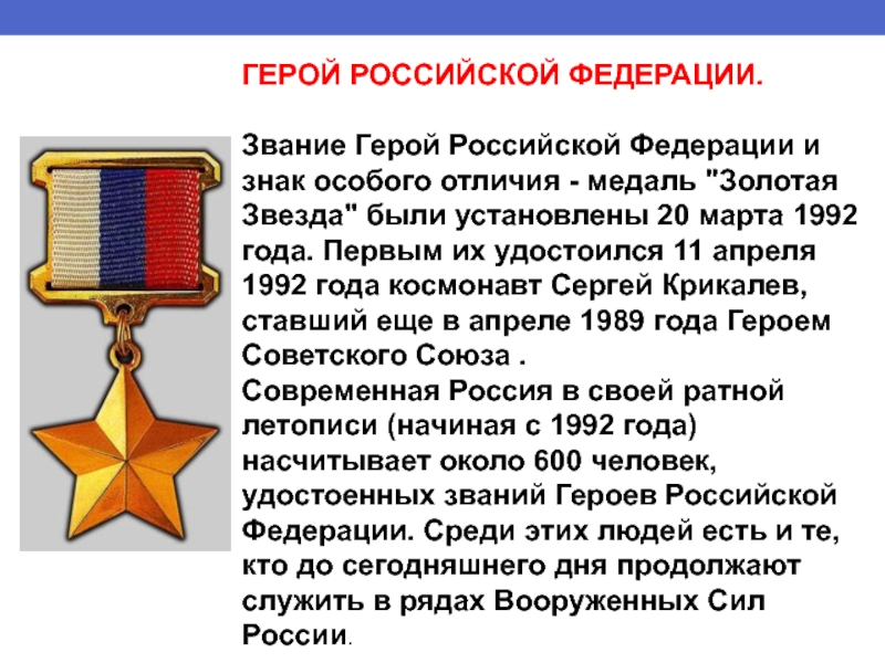 медаль "Золотая Звезда" были установлены 20 марта 1992 года. Первым их удостоился 11 апреля 1992 года космонавт Сергей Крикалев, ставший еще в апреле 1989 года Героем Советского Союза .
