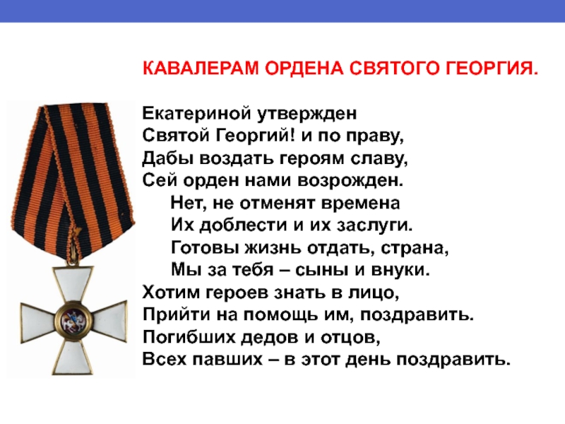 Святой Георгий! и по праву, Дабы воздать героям славу, Сей орден нами возрожден.