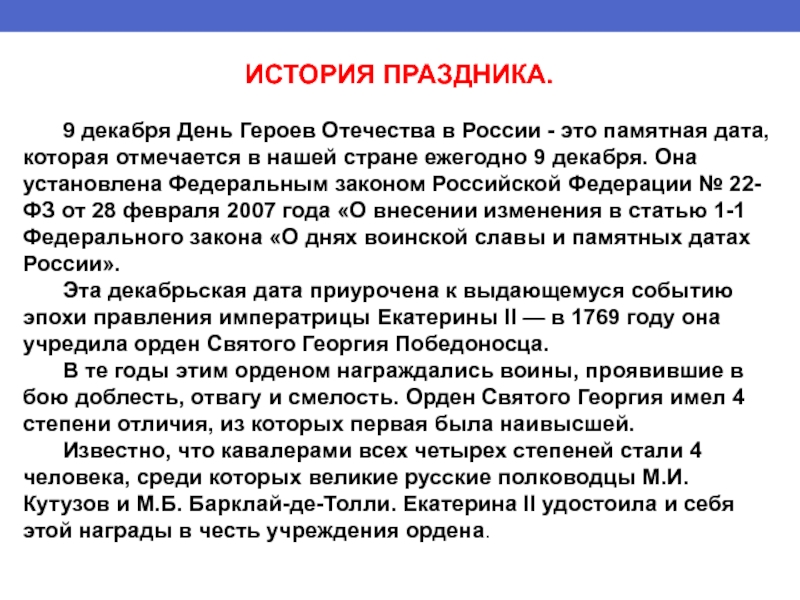ИСТОРИЯ ПРАЗДНИКА.	9 декабря День Героев Отечества в России - это памятная дата, которая отмечается в нашей стране