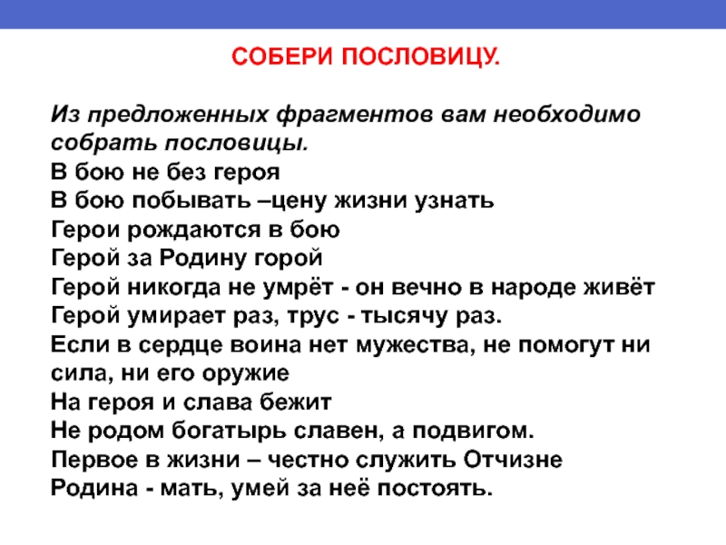 СОБЕРИ ПОСЛОВИЦУ. Из предложенных фрагментов вам необходимо собрать пословицы.В бою не без герояВ бою побывать –цену жизни