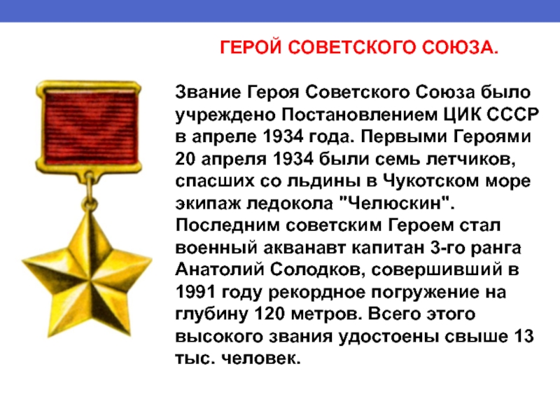 в апреле 1934 года. Первыми Героями 20 апреля 1934 были семь летчиков, спасших со льдины в Чукотском море экипаж ледокола "Челюскин". Последним советским Героем стал военный акванавт капитан 3-го ранга Анатолий Солодков, совершивший в 1991 году рекордное погружение на глубину 120 метров. Всего этого высокого звания удостоены свыше 13 тыс. человек.