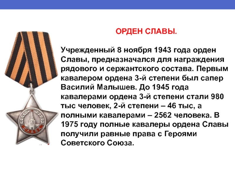 рядового и сержантского состава. Первым кавалером ордена 3-й степени был сапер Василий Малышев. До 1945 года кавалерами ордена 3-й степени стали 980 тыс человек, 2-й степени – 46 тыс, а полными кавалерами – 2562 человека. В 1975 году полные кавалеры ордена Славы получили равные права с Героями Советского Союза.